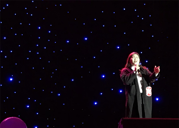 大赛冠军  音乐表演172班的王钠钠演唱的曲目是《她说》,细腻的声线,动人的演唱展现了很高的出了歌唱水平。