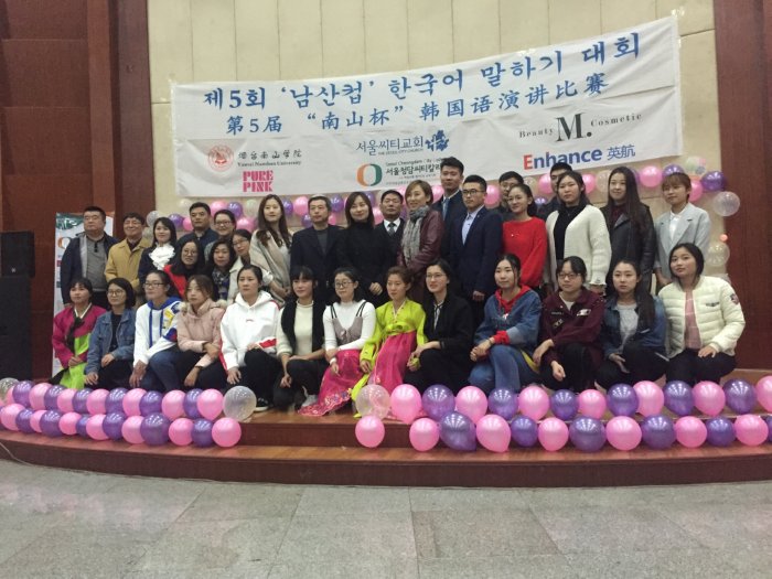 11月1日,由THE SEOUL CITY CHURCH、 Beauty M. Cosmetic、PURE PINK、Seoul Cheongdam City College、Enhance联合主办,由我校人文学院外语系韩国语教研室承办的第五届“南山杯”韩国语演讲比赛圆满落幕。王慧颖同学《不抛弃、不放弃》荣获特等奖;《我10年后的样子》蒋迪同学荣获一等奖,沈钊纯同学、袁梦和朱红丽同学荣获了二、三等奖。