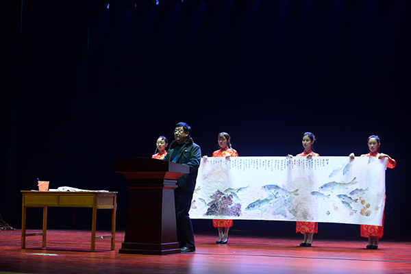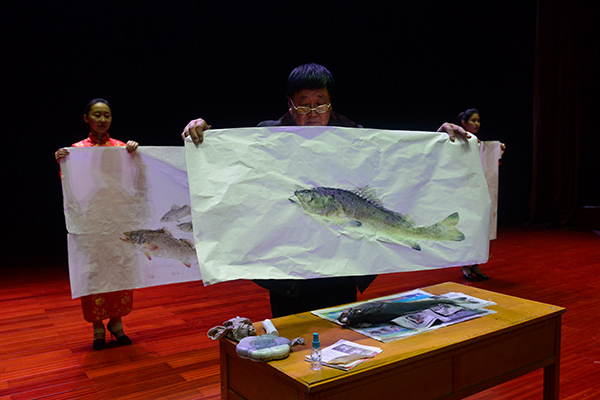 迟本年老师现场以真鱼做画,伴随着激情澎拜的演讲,将一张白色宣纸覆盖其上。片刻,一条活灵活现的鲈鱼便跃然纸上。