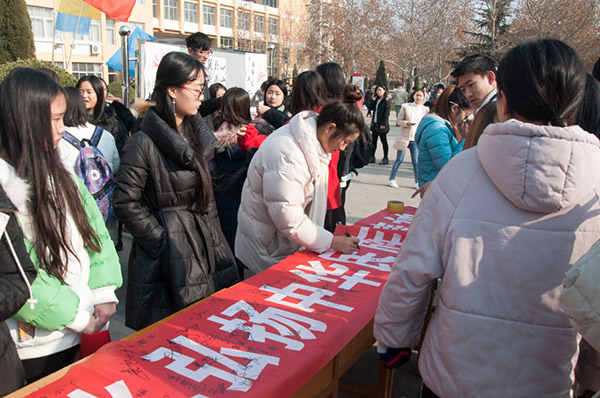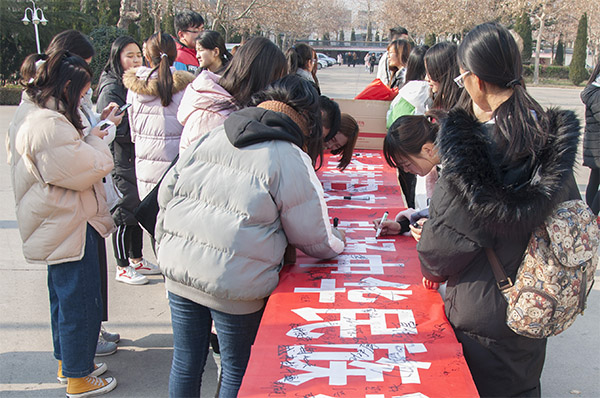 中午,同学们在“传承传统节日文化,弘扬中华民族精神”横幅上签上自己的名字,表达自己对传统文化的尊重和热爱。