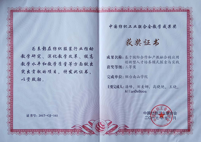 12月18日,由中国纺织工业联合会主办的“纺织之光2017年度中国纺织工业联合会科技教育奖励大会”在北京人民大会堂隆重召开。中国纺织工业联合会党委书记兼秘书长、纺织之光科技教育基金会理事长高勇;中国纺织工业联合会会长孙瑞哲,原会长杜钰洲、王天凯;中国棉花协会原会长林乃基、中国纺织工业联合会副会长杨纪朝、夏令敏等行业领导,以及各高校代表、企业代表、行业协会等600余人参加此次盛会。bet28365365备用网站申报的“基于国际合作和产教融合的应用创新型人才培养模式探索与实践”荣获纺织高等教育教学成果奖三等奖。